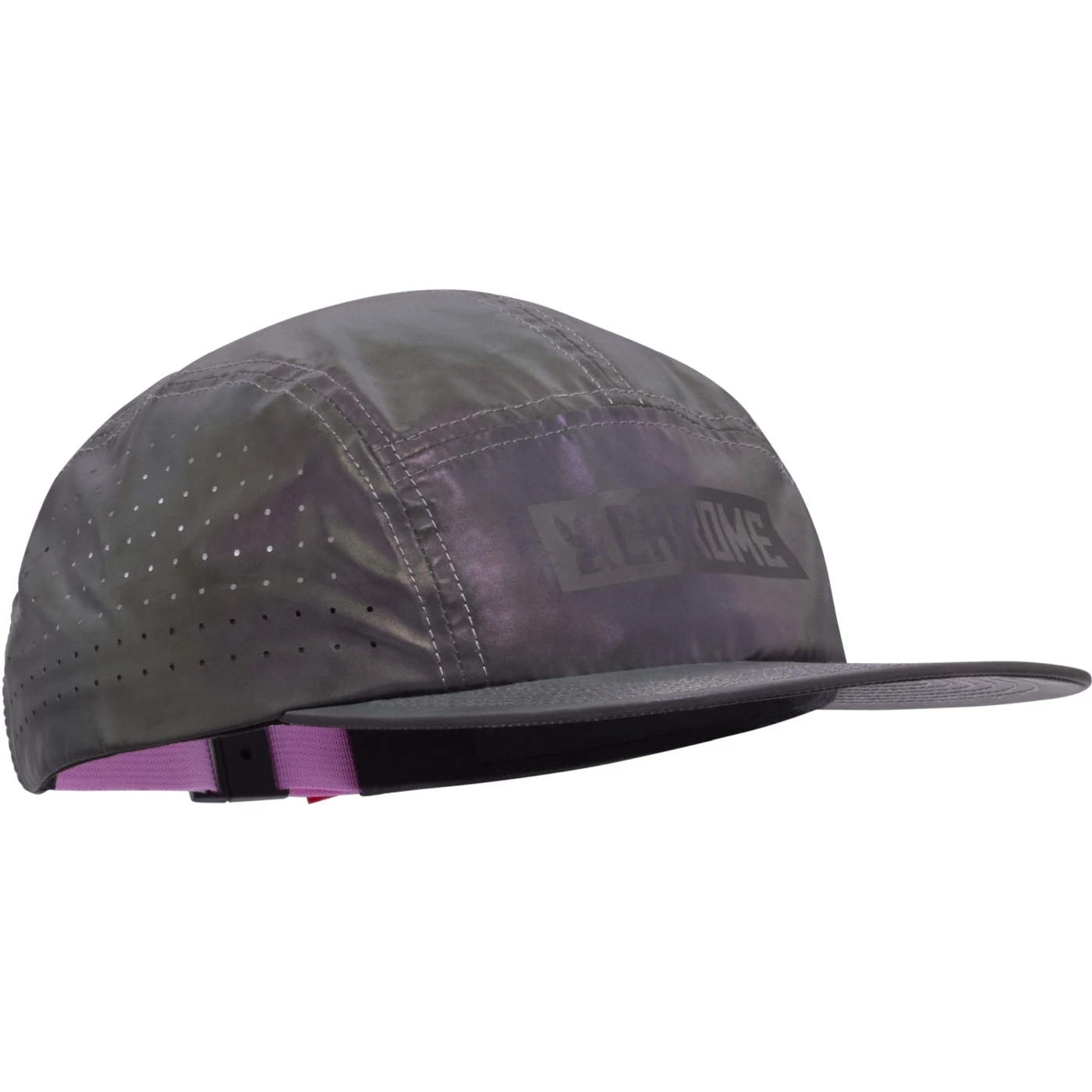 The fully reflective 5 panel hat is engineered with side perforations for added ventilation.